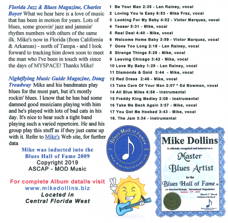 Mike and his bandmates play blues for the most part, but it's mostly rockin' blues. I know that he has had some damned good musicians playing with him and he's played with lots of bad cats in his day. It's nice to hear such a tight band playing such a varied repertoire. He and his group play this stuff as if they just came up with it. Refer to Mike's Web site, for further data. www.mikedollins.biz